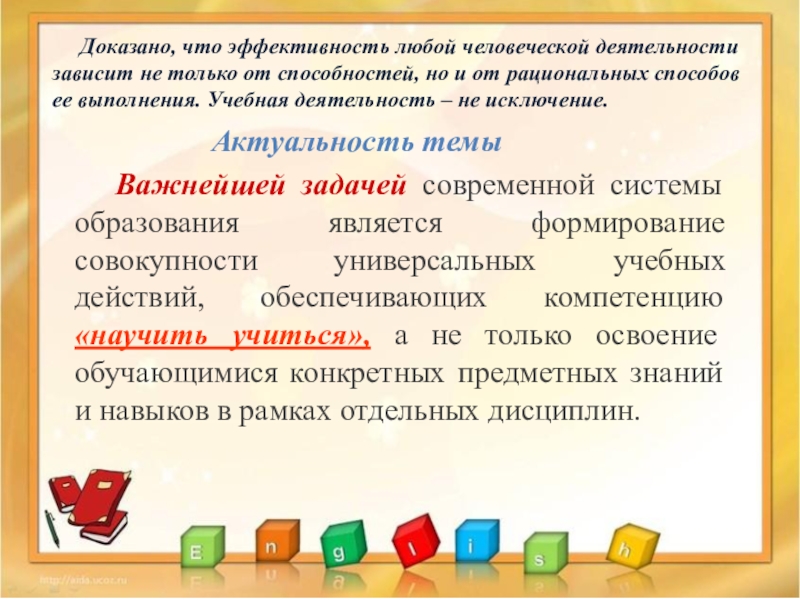 Важнейшей задачей современной системы образования является формирование совокупности универсальных учебных действий, обеспечивающих компетенцию «научить учиться», а не только освоение обучающимися конкретных предметных знаний и навыков в рамках отдельных дисциплин.