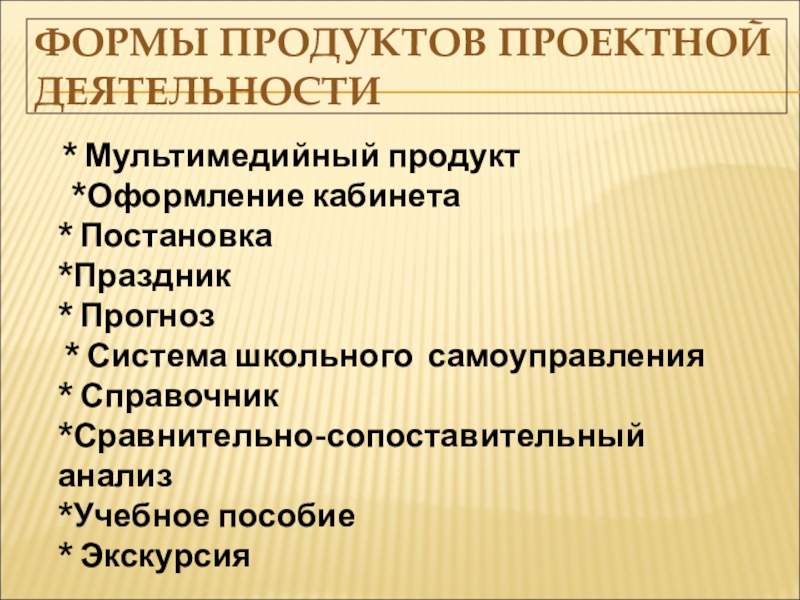 Слайд 9ФОРМЫ ПРОДУКТОВ ПРОЕКТНОЙ ДЕЯТЕЛЬНОСТИ