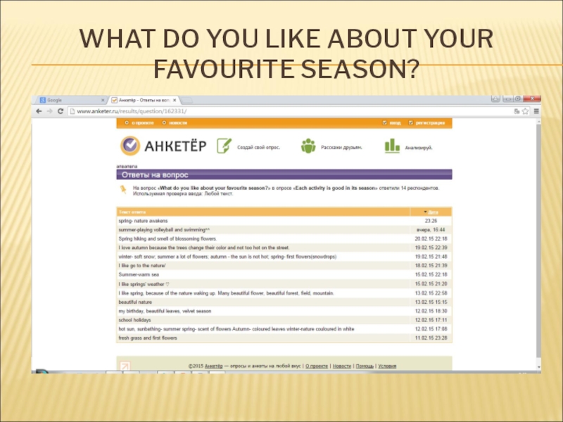 Слайд 17WHAT DO YOU LIKE ABOUT YOUR FAVOURITE SEASON?