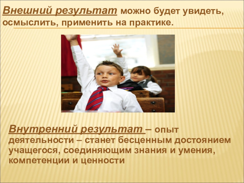 Внешний результат можно будет увидеть, осмыслить, применить на практике.