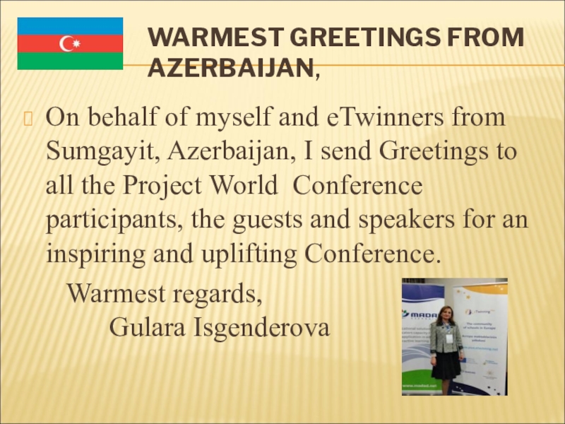 Azerbaijan, I send Greetings to all the Project World Conference participants, the guests and speakers for an inspiring and uplifting Conference.