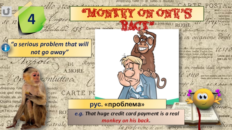 e.g. That huge credit card payment is a real monkey on his back.