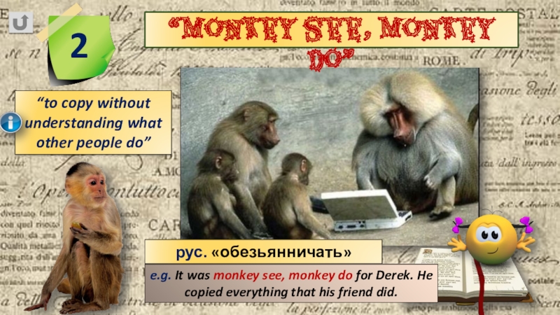 e.g. It was monkey see, monkey do for Derek. He copied everything that his friend did.