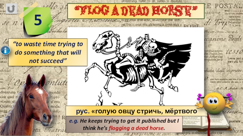 e.g. He keeps trying to get it published but I think he’s flogging a dead horse.