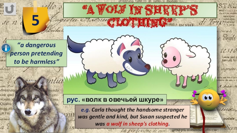 e.g. Carla thought the handsome stranger was gentle and kind, but Susan suspected he was a wolf in sheep's clothing.