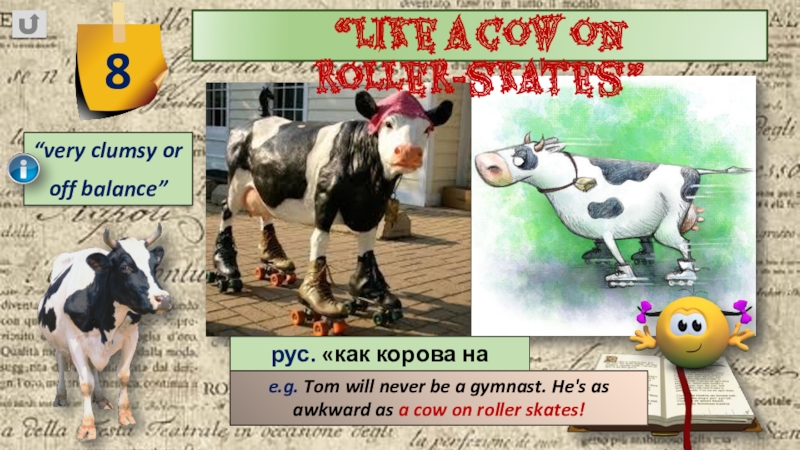 e.g. Tom will never be a gymnast. He's as awkward as a cow on roller skates!