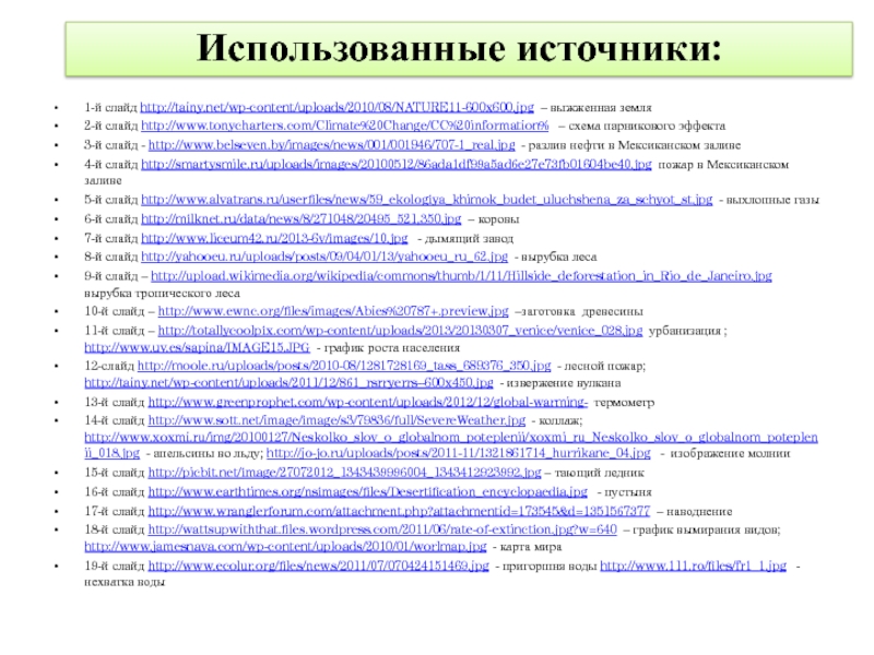 18-й слайд http://wattsupwiththat.files.wordpress.com/2011/06/rate-of-extinction.jpg?w=640 – график вымирания видов; http://www.jamesnava.com/wp-content/uploads/2010/01/worlmap.jpg - карта мира