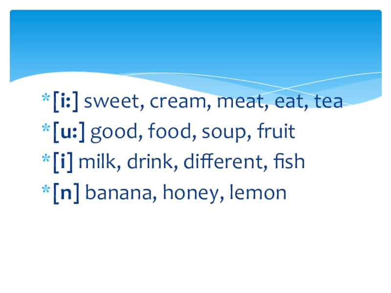 [i:] sweet, cream, meat, eat, tea[u:] good, food, soup, fruit[i] milk, drink, different, fish[n] banana, honey, lemon