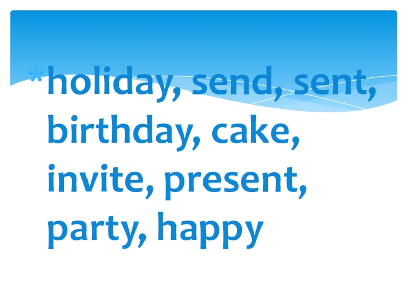 Слайд 9holiday, send, sent, birthday, cake, invite, present, party, happy