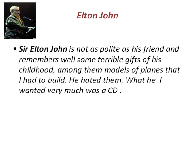 For example, Britney Spears remembers that her grandmother adored [əˈdɔːd] (обожать) presenting her with socks. The singer confides [kənˈfaɪd] (откровенничать): “Of course, it is your relatives` attention that is important and every gift is good but socks – it’s too much’