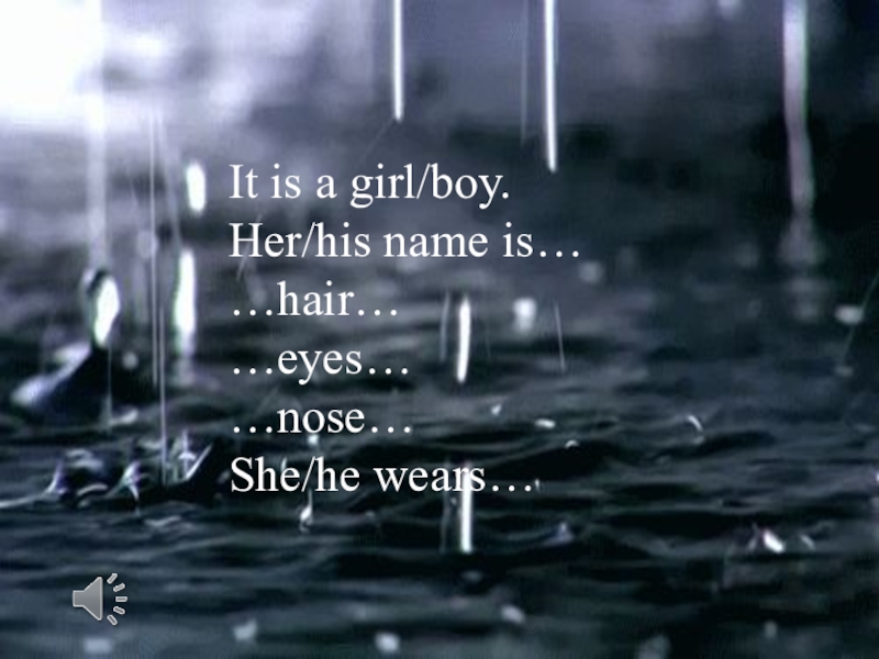 It is a girl/boy.Her/his name is……hair……eyes……nose…She/he wears…