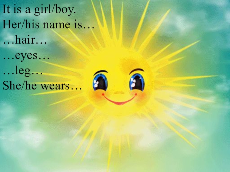 It is a girl/boy.Her/his name is……hair……eyes……leg…She/he wears…
