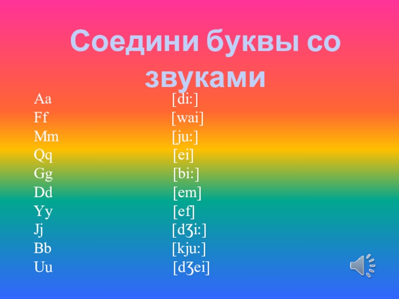 Aa                               [di:]Ff                                [wai]Mm                             [ju:]Qq                               [ei]Gg                               [bi:]Dd                               [em]Yy                               [ef]Jj                                 [dƷi:]Bb                               [kju:]Uu                               [dƷei]Соедини буквы со звуками