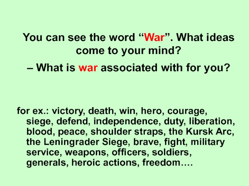 for ex.: victory, death, win, hero, courage, siege, defend, independence, duty, liberation, blood, peace, shoulder straps, the Kursk Arc, the Leningrader Siege, brave, fight, military service, weapons, officers, soldiers, generals, heroic actions, freedom….