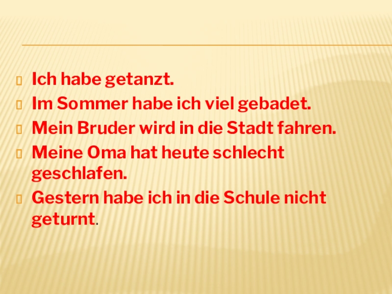 Ich habe getanzt.Im Sommer habe ich viel gebadet.Mein Bruder wird in die Stadt fahren.Meine Oma hat heute