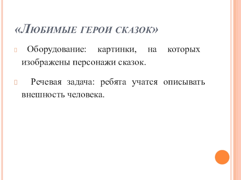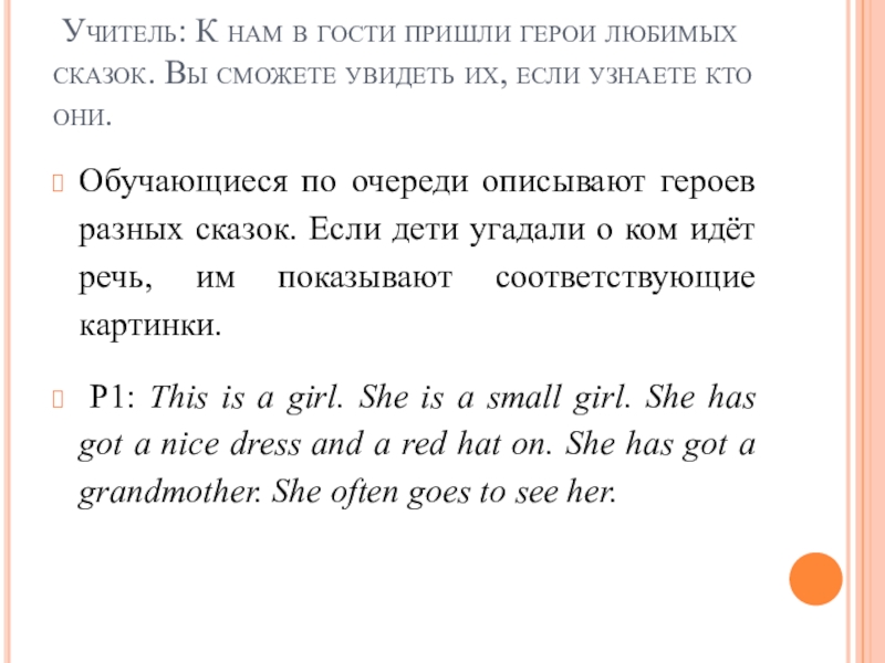 Обучающиеся по очереди описывают героев разных сказок. Если дети угадали о ком идёт речь, им показывают соответствующие картинки.