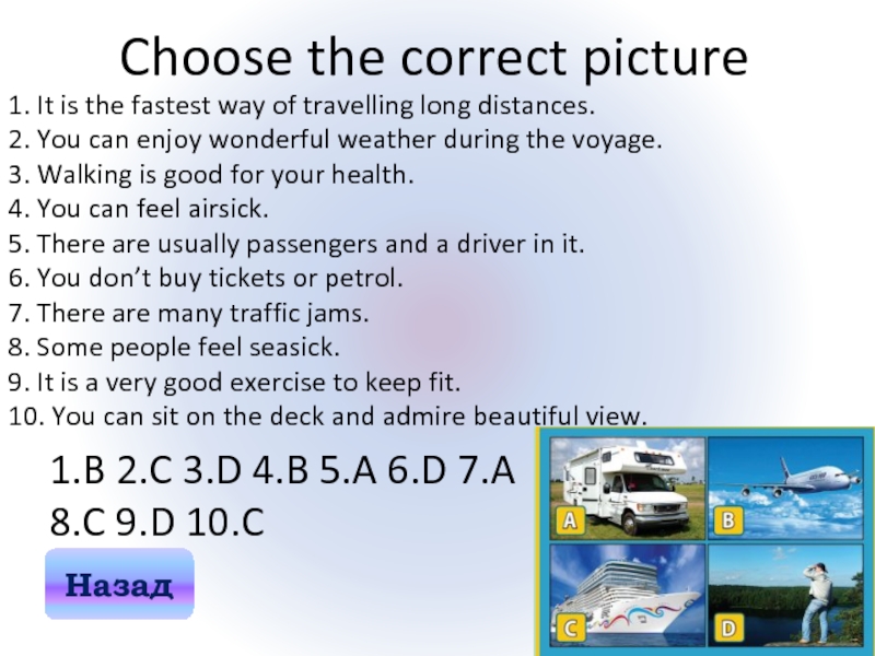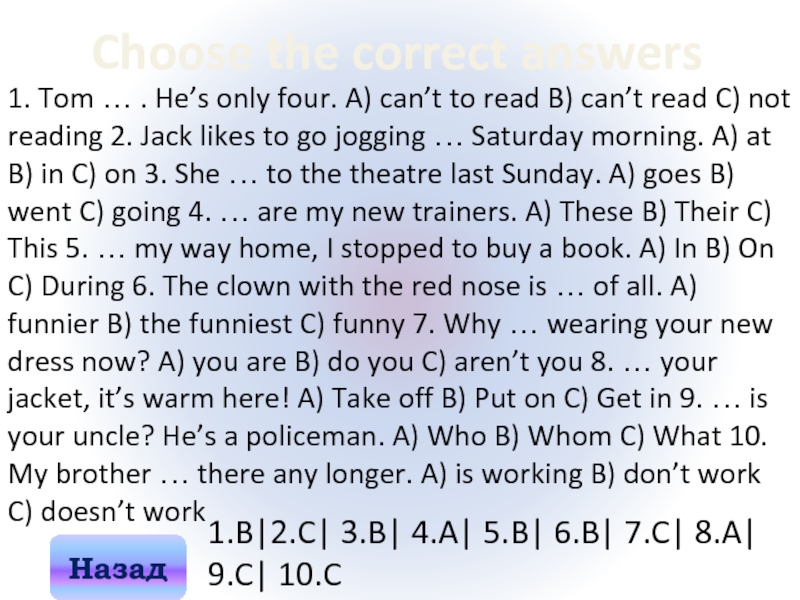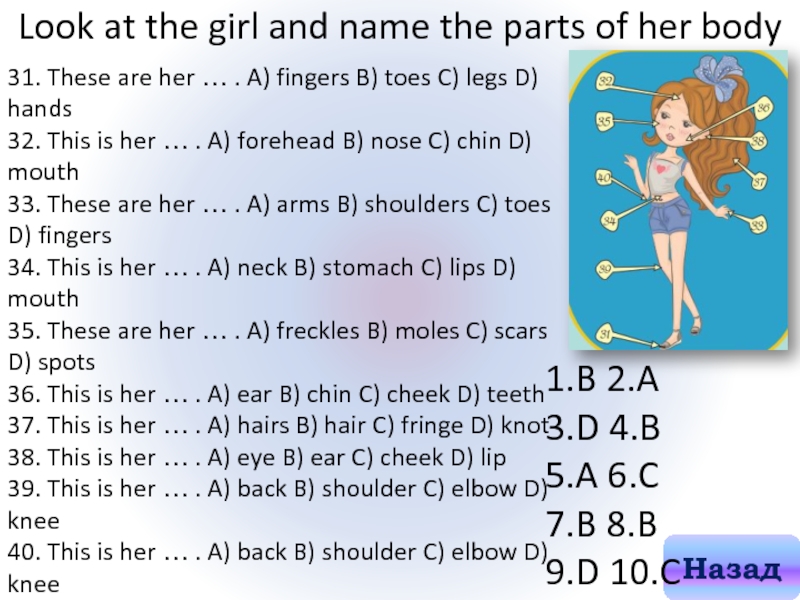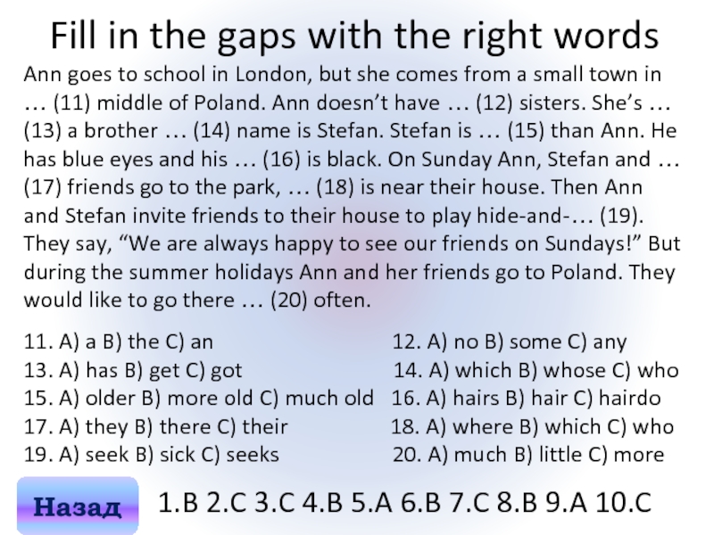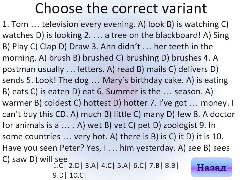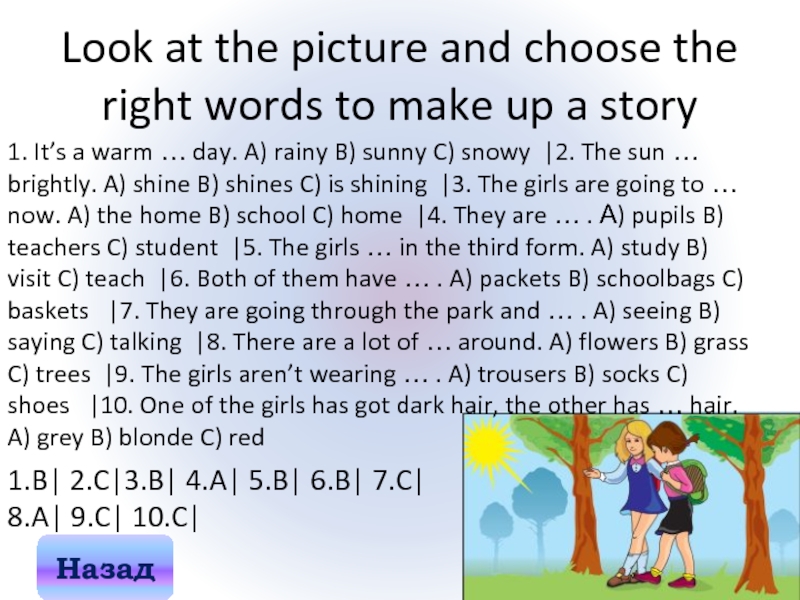 1. It’s a warm … day. A) rainy B) sunny C) snowy |2. The sun … brightly. A) shine B) shines C) is shining |3. The girls are going to … now. A) the home B) school C) home |4. They are … . А) pupils B) teachers C) student |5. The girls … in the third form. A) study B) visit C) teach |6. Both of them have … . A) packets B) schoolbags C) baskets |7. They are going through the park and … . A) seeing B) saying C) talking |8. There are a lot of … around. A) flowers B) grass C) trees |9. The girls aren’t wearing … . A) trousers B) socks C) shoes |10. One of the girls has got dark hair, the other has … hair. A) grey B) blonde C) red