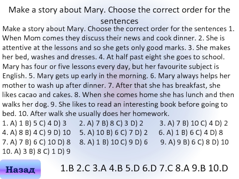 Make a story about Mary. Choose the correct order for the sentences 1. When Mom comes they discuss their news and cook dinner. 2. She is attentive at the lessons and so she gets only good marks. 3. She makes her bed, washes and dresses. 4. At half past eight she goes to school. Mary has four or five lessons every day, but her favourite subject is English. 5. Mary gets up early in the morning. 6. Mary always helps her mother to wash up after dinner. 7. After that she has breakfast, she likes cacao and cakes. 8. When she comes home she has lunch and then walks her dog. 9. She likes to read an interesting book before going to bed. 10. After walk she usually does her homework.