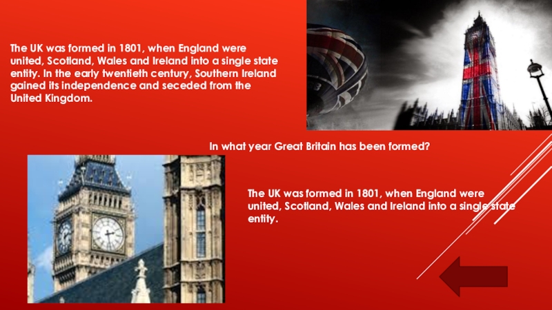 The UK was formed in 1801, when England were united, Scotland, Wales and Ireland into a single state entity.