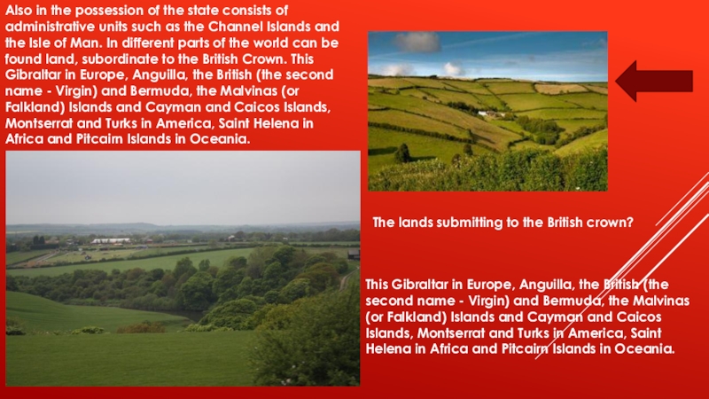 This Gibraltar in Europe, Anguilla, the British (the second name - Virgin) and Bermuda, the Malvinas (or Falkland) Islands and Cayman and Caicos Islands, Montserrat and Turks in America, Saint Helena in Africa and Pitcairn Islands in Oceania.