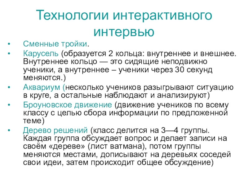 Интервью. Общим признаком этой группы приемов является задача опросить как можно больше присутствующих, с тем, чтобы выяснить их мнения, суждения, ответы на поставленные вопросы. Для этого школьники, работая одновременно, свободно перемещаются по классу, выбирают ученика, которому адресуют свои вопросы, фиксируют ответы в записной книжке.