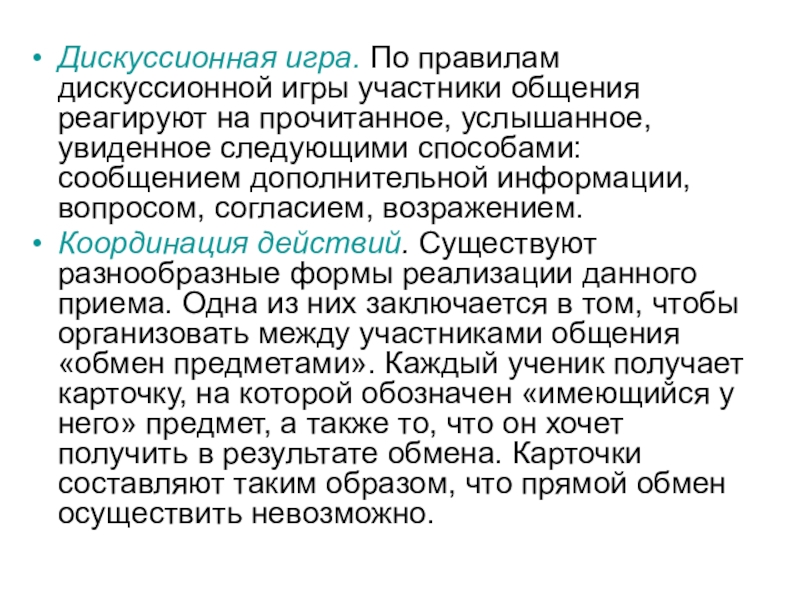 Слайд 14Дискуссионная игра. По правилам дискуссионной игры участники общения реагируют на прочитанное,