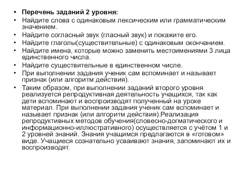 Таким образом, при выполнении заданий второго уровня реализуется репродуктивная деятельность учащихся, так как дети вспоминают и воспроизводят полученный на уроке материал. При выполнении задания ученик сам вспоминает и называет признак (или алгоритм действия).Реализация репродуктивных методов обучения(словесно-догматического и информационно-иллюстративного) осуществляется с учётом 1 и 2 уровней знаний. Знания учащимся предлагаются в «готовом» виде. Учащиеся сознательно усваивают знания, запоминают их и воспроизводят.