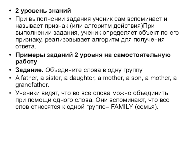 На этом уровне создаются ситуации, когда ученик сам должен вспомнить признак (признаки) объекта или алгоритм действия и выполнить задание,связанное с выявлением соответствия или несоответствия предъявленного объекта его существенному признаку (признакам) или реализацией необходимого для получения ответа алгоритма.