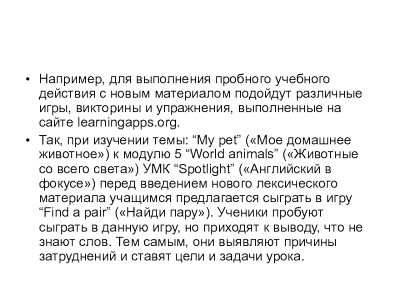 Так, при изучении темы: “My pet” («Мое домашнее животное») к модулю 5 “World animals” («Животные со всего света») УМК “Spotlight” («Английский в фокусе») перед введением нового лексического материала учащимся предлагается сыграть в игру “Find a pair” («Найди пару»). Ученики пробуют сыграть в данную игру, но приходят к выводу, что не знают слов. Тем самым, они выявляют причины затруднений и ставят цели и задачи урока.