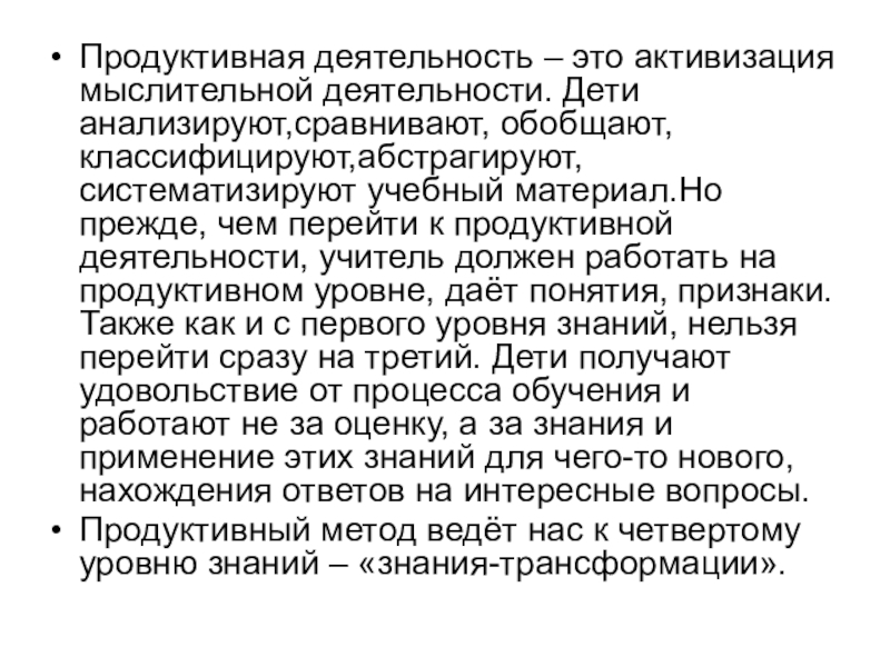 систематизируют учебный материал.Но прежде, чем перейти к продуктивной деятельности, учитель должен работать на продуктивном уровне, даёт понятия, признаки.Также как и с первого уровня знаний, нельзя перейти сразу на третий. Дети получают удовольствие от процесса обучения и работают не за оценку, а за знания и применение этих знаний для чего-то нового, нахождения ответов на интересные вопросы.