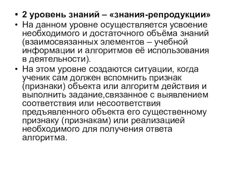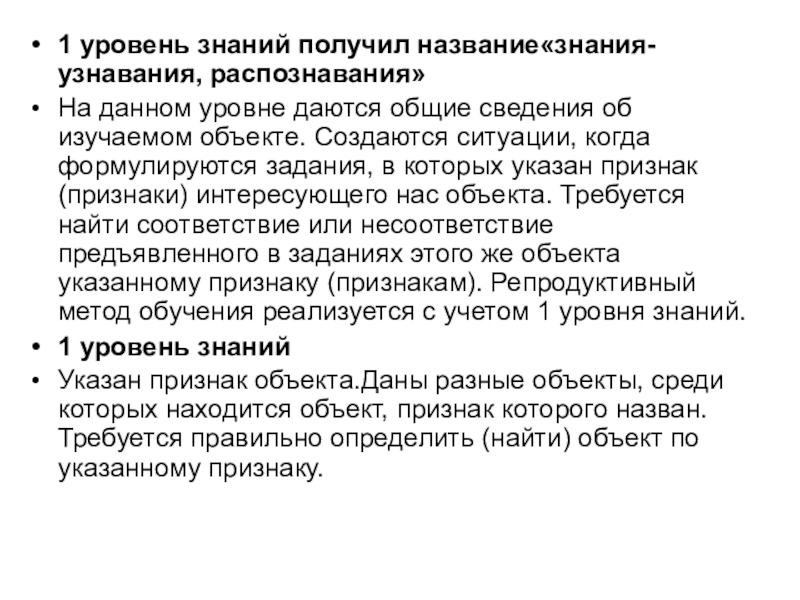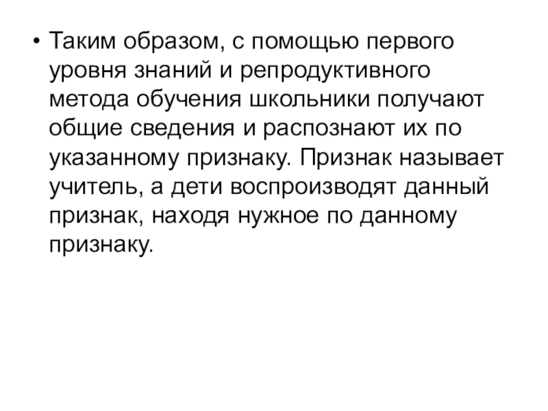 Слайд 33Таким образом, с помощью первого уровня знаний и репродуктивного метода обучения