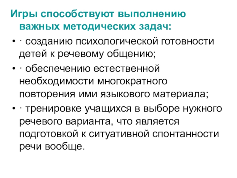 Слайд 8Игры способствуют выполнению важных методических задач: