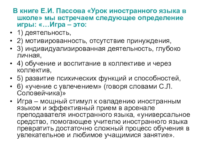 Слайд 4 В книге Е.И. Пассова «Урок иностранного языка в школе» мы