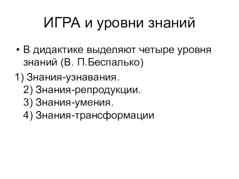 В дидактике выделяют четыре уровня знаний (В. П.Беспалько)