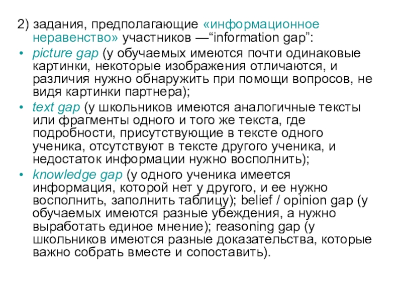 knowledge gap (у одного ученика имеется информация, которой нет у другого, и ее нужно восполнить, заполнить таблицу); belief / opinion gap (у обучаемых имеются разные убеждения, а нужно выработать единое мнение); reasoning gap (у школьников имеются разные доказательства, которые важно собрать вместе и сопоставить).