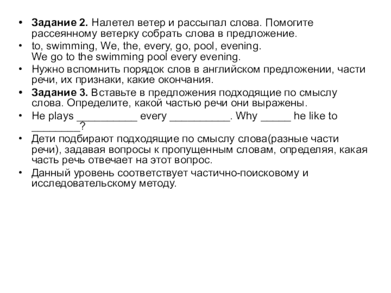 Дети подбирают подходящие по смыслу слова(разные части речи), задавая вопросы к пропущенным словам, определяя, какая часть речь отвечает на этот вопрос.