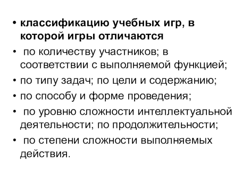 Слайд 28классификацию учебных игр, в которой игры отличаются