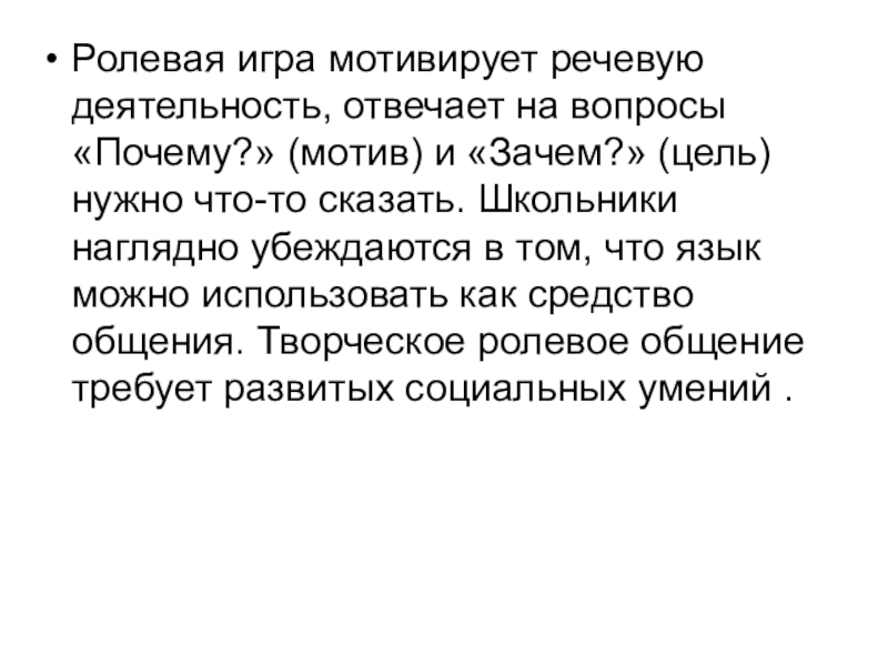 «Зачем?» (цель) нужно что-то сказать. Школьники наглядно убеждаются в том, что язык можно использовать как средство общения. Творческое ролевое общение требует развитых социальных умений .