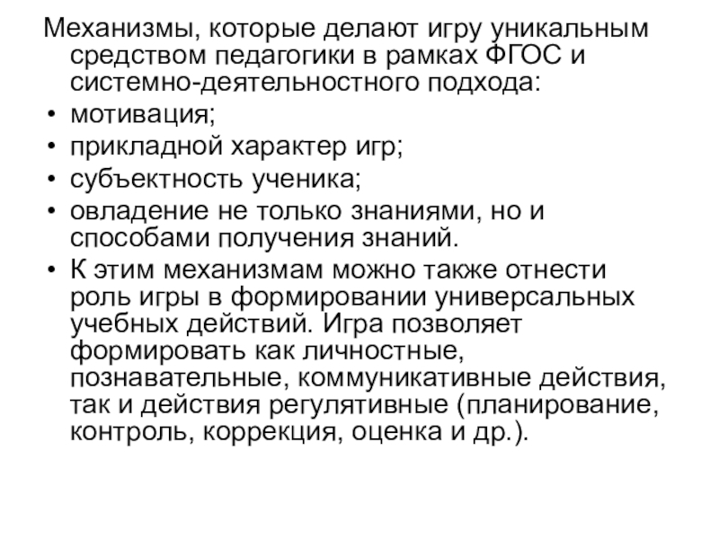 Слайд 2Механизмы, которые делают игру уникальным средством педагогики в рамках ФГОС и
