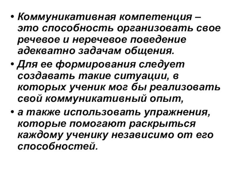 Слайд 9Коммуникативная компетенция – это способность организовать свое речевое и неречевое поведение