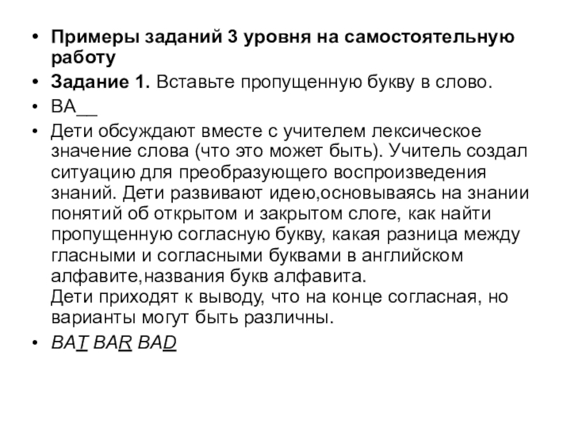 Дети обсуждают вместе с учителем лексическое значение слова (что это может быть). Учитель создал ситуацию для преобразующего воспроизведения знаний. Дети развивают идею,основываясь на знании понятий об открытом и закрытом слоге, как найти пропущенную согласную букву, какая разница между гласными и согласными буквами в английском алфавите,названия букв алфавита.
