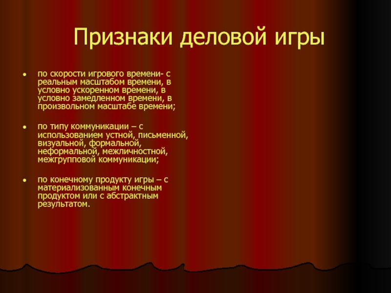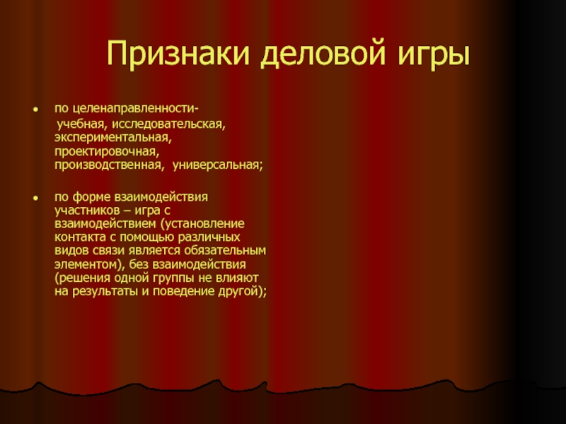 по форме взаимодействия участников – игра с взаимодействием (установление контакта с помощью различных видов связи является обязательным элементом), без взаимодействия (решения одной группы не влияют на результаты и поведение другой);