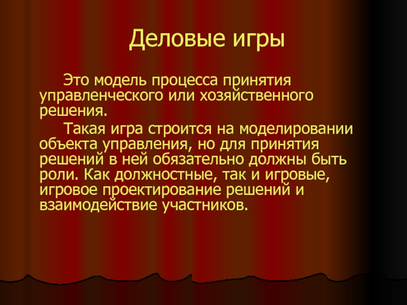 Такая игра строится на моделировании объекта управления, но для принятия решений в ней обязательно должны быть роли. Как должностные, так и игровые, игровое проектирование решений и взаимодействие участников.