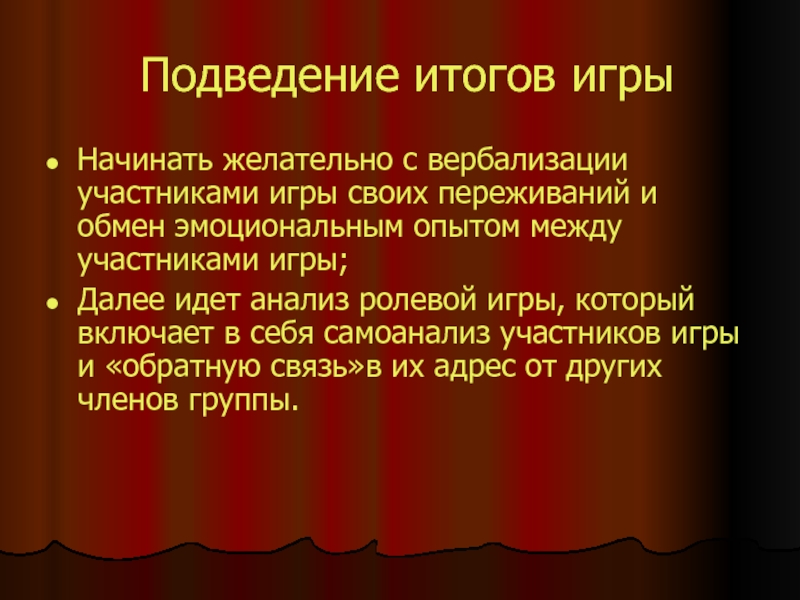 Далее идет анализ ролевой игры, который включает в себя самоанализ участников игры и «обратную связь»в их адрес от других членов группы.