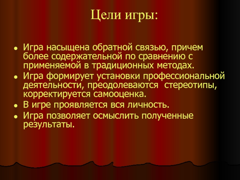 Игра формирует установки профессиональной деятельности, преодолеваются стереотипы, корректируется самооценка.