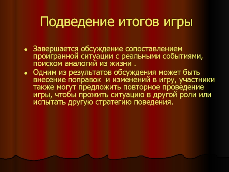 Одним из результатов обсуждения может быть внесение поправок и изменений в игру, участники также могут предложить повторное проведение игры, чтобы прожить ситуацию в другой роли или испытать другую стратегию поведения.
