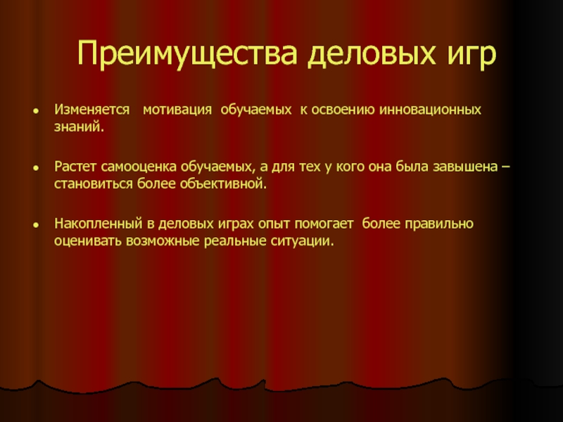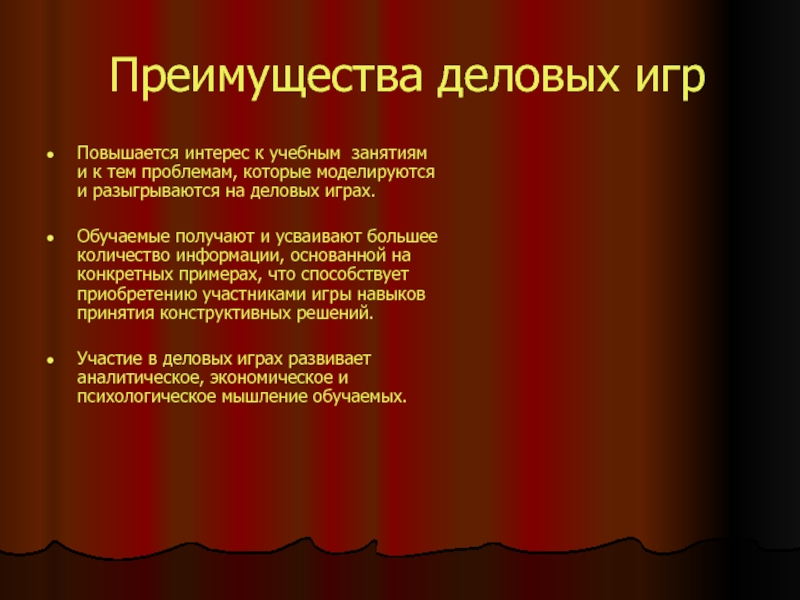 Участие в деловых играх развивает аналитическое, экономическое и психологическое мышление обучаемых.