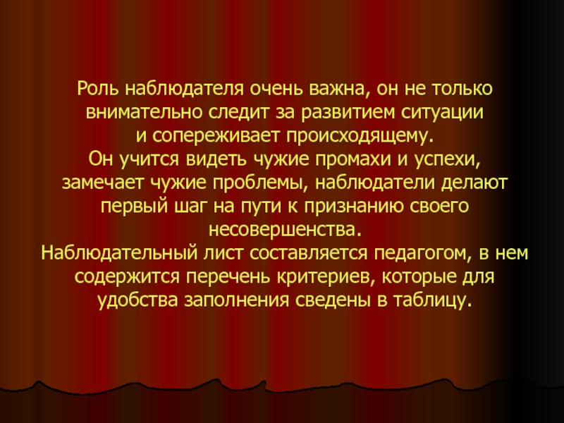 Слайд 17Роль наблюдателя очень важна, он не только внимательно следит за развитием