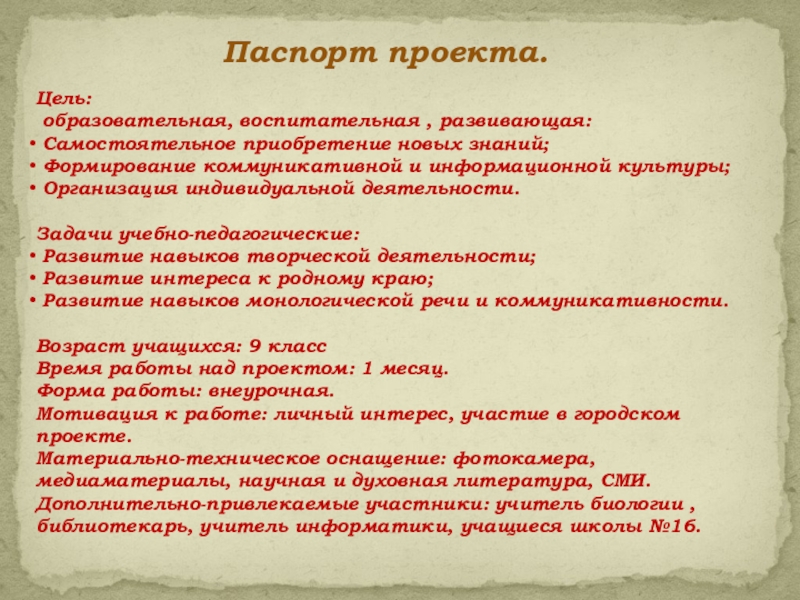 Дополнительно-привлекаемые участники: учитель биологии , библиотекарь, учитель информатики, учащиеся школы №16.