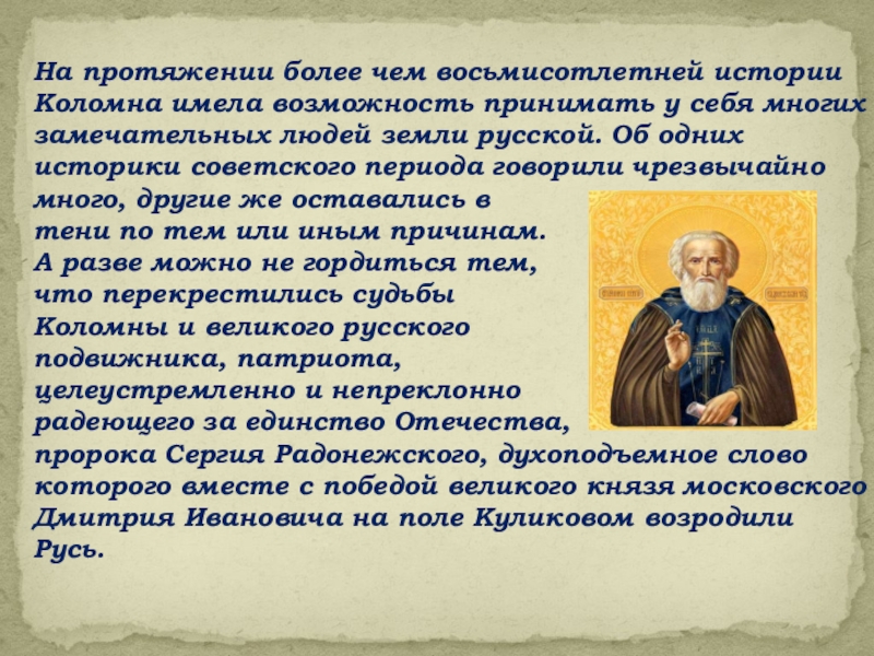 пророка Сергия Радонежского, духоподъемное слово которого вместе с победой великого князя московского Дмитрия Ивановича на поле Куликовом возродили Русь.